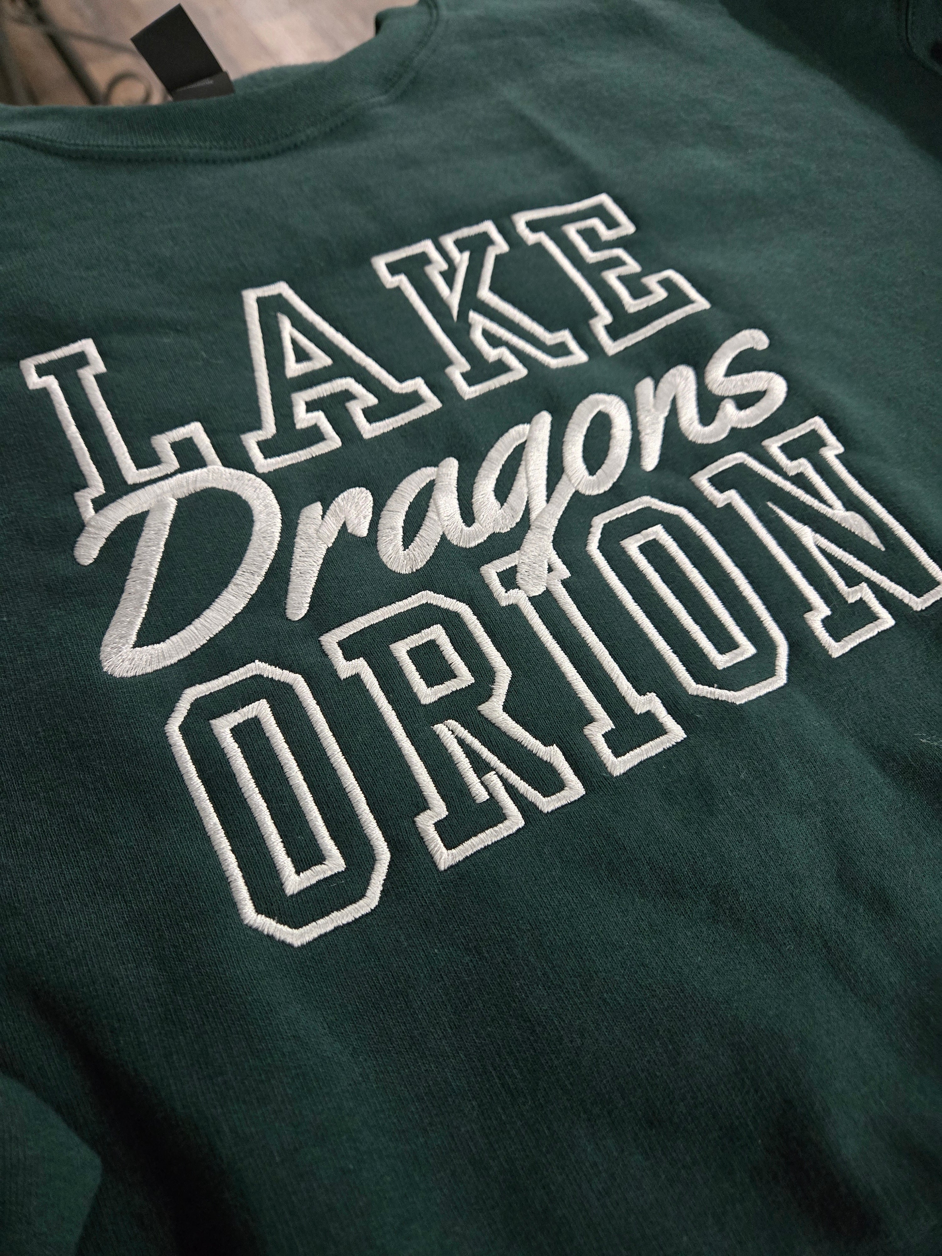 Our Lake Orion Dragons crewneck features full-front embroidery with a classic varsity block and script combo. A timeless, elevated take on school spirit.